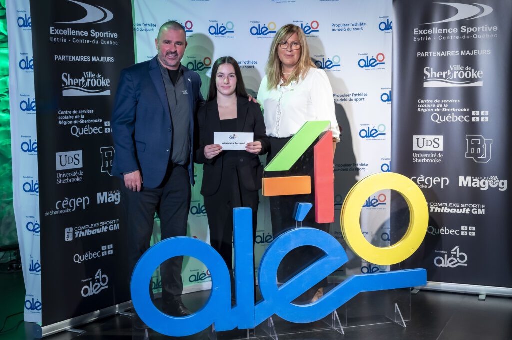 Une bourse qui propulse une gymnaste sherbrookoise vers l’avenir ! Photo Jessica Garneau – Rémy Fontaine, directeur général d’Excellence Sportive Sherbrooke, Alexandra Perreault et Patricia Demers, directrice générale de la Fondation Aléo. À…