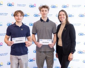 Parmi le groupe de donateurs du programme Accès Nouvelle Générations, trois familles se sont mobilisées pour soutenir un·e étudiant·e-athlète sélectionné·e. Le clan Turcotte-Groulx a remis sa bourse au triathlonien de Drummondville Simon Gagné, les Esparbès s’allient à Mia Durocher, une patineuse de vitesse courte piste, et les nouveaux donateurs, la famille Brassard, ont été jumelés à un gymnaste, Mikaël Morin. Les familles Esparbès et Brassard ont amassé les fonds de leur bourse en participant aux épreuves du Marathon Beneva de Montréal, au profit de la Fondation Aléo.